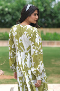 Capture the essence of a free spirit with the Emerald Charm dress. Handcrafted from 100% cotton, this olive green and white stunner brings a bohemian flair to your wardrobe. With its relaxed, anti-fit silhouette and intricate prints, this dress is perfect for a laid-back holiday vibe.